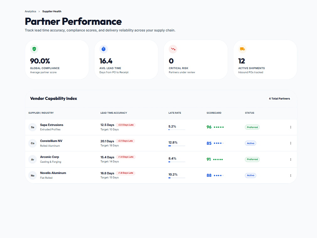 The platform also provides clear visibility into supplier performance. Teams can track lead time accuracy, late deliveries, and compliance scores in a dedicated analytics dashboard. This helps identify high-risk vendors, improve sourcing decisions, and maintain reliable supply chains. AI further supports this by generating demand forecasts and smart reorder recommendations.