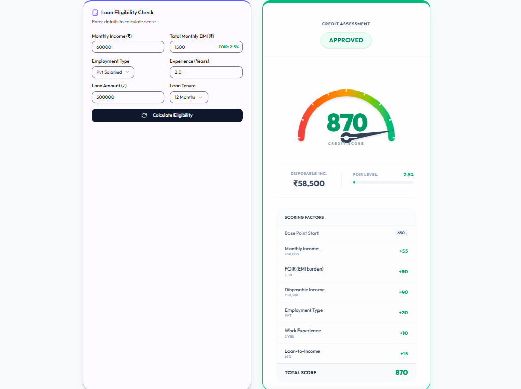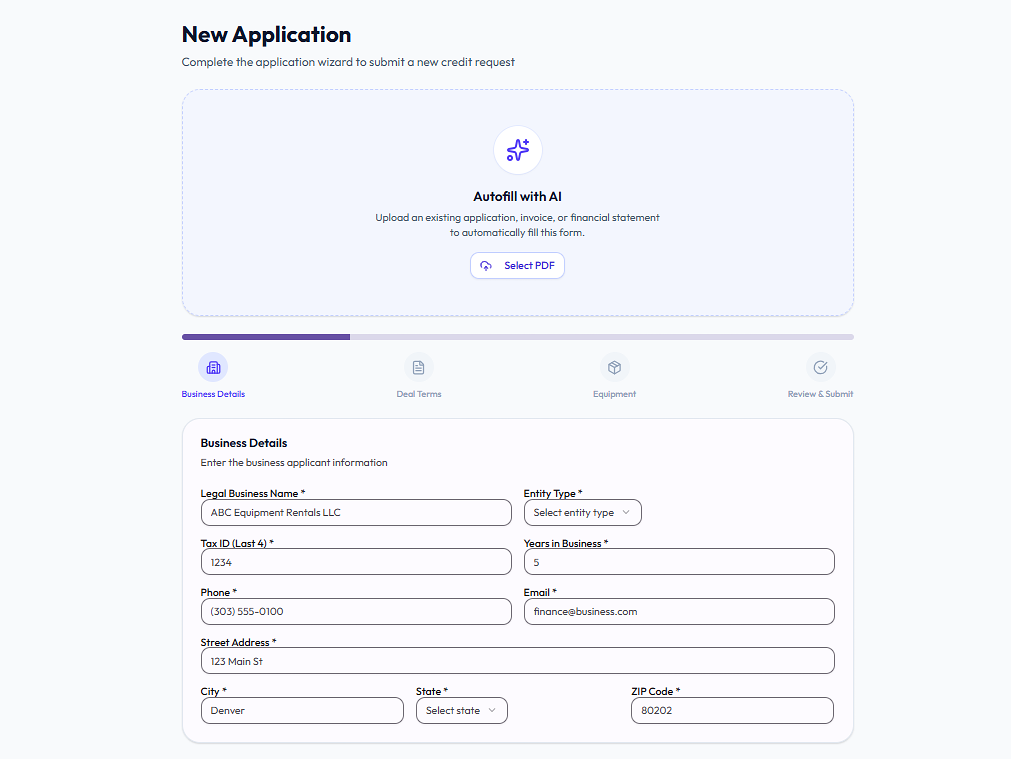 The Loan Eligibility module serves as the entry point for brokers and sales teams, designed as a four-step wizard: Business Details → Deal Terms → Equipment → Review & Submit. Users begin by entering business details such as legal name, entity type, years in operation, and address. The next step captures deal structure — loan amount, term, deal type, and purpose — with dynamic validation. Equipment details like category, condition, vendor, and invoice amount are then collected, along with optional documents. Once submitted, the application is locked, mapped to the active policy version, and stored. An AI-powered PDF Autofill feature also extracts data from uploaded documents to pre-fill fields and reduce manual effort. Then instantly provides Credit score for you.