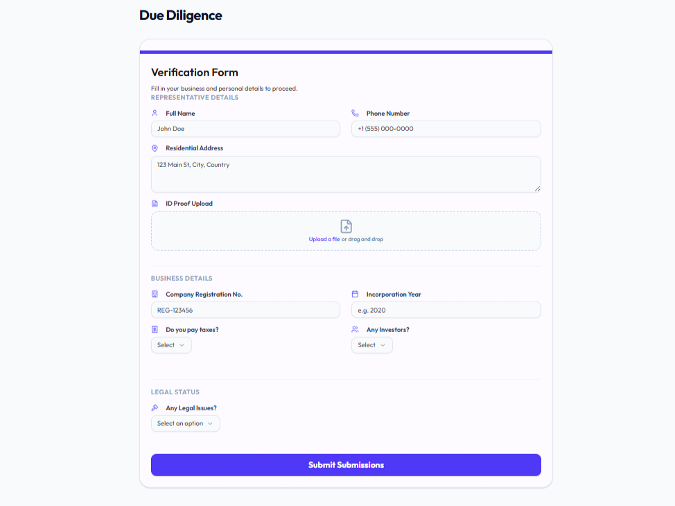 The Due Diligence module transitions the workflow into structured risk and compliance assessment. It includes a verification form with three sections: Representative Details, Business Details, and Legal Status. Representative Details captures contact information and requires an identity proof document. Business Details includes registration number, incorporation year, tax compliance status, and investor count, with conditional fields for better usability. Legal Status checks for ongoing legal issues and dynamically expands to capture details and supporting documents if needed. Based on inputs, the system returns either a standard review confirmation (24–48 hours) or a “Decision Pending” status for further scrutiny. This module acts as a key KYB/KYC checkpoint, ensuring compliance before any application moves forward.