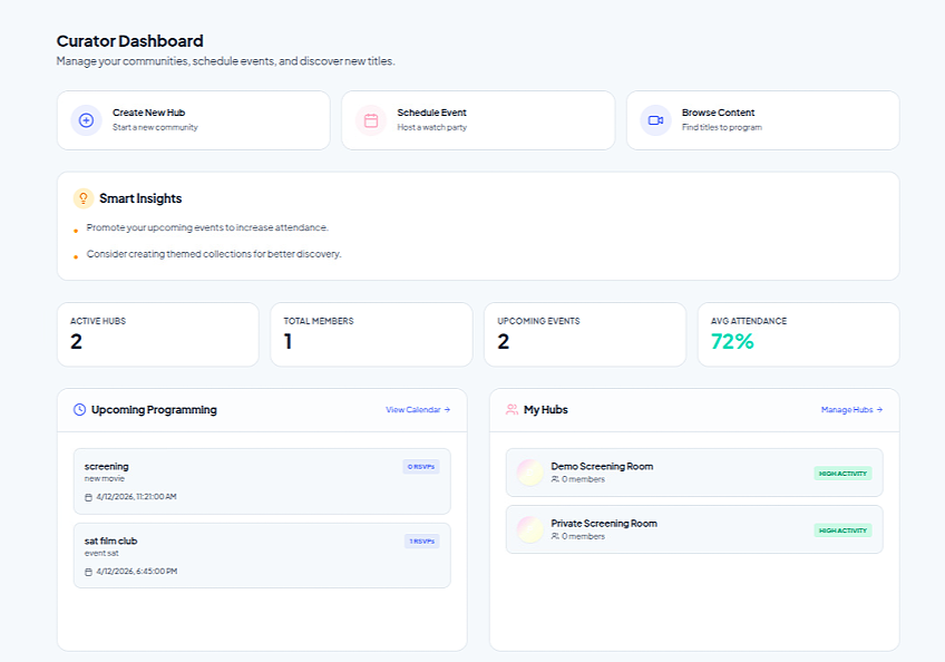 It is important to understand who saw the movie. It is even more important to understand how they came there, which event made them see a movie, and which referral chain made them go to that particular event. Nestack’s Curator module offers a solution for filmmakers by providing the Hubs where the audiences can be accumulated, Events with a schedule of showings and discussions, and after-event analysis, showing the number of participants who actually attended a showing and completed the film watching.