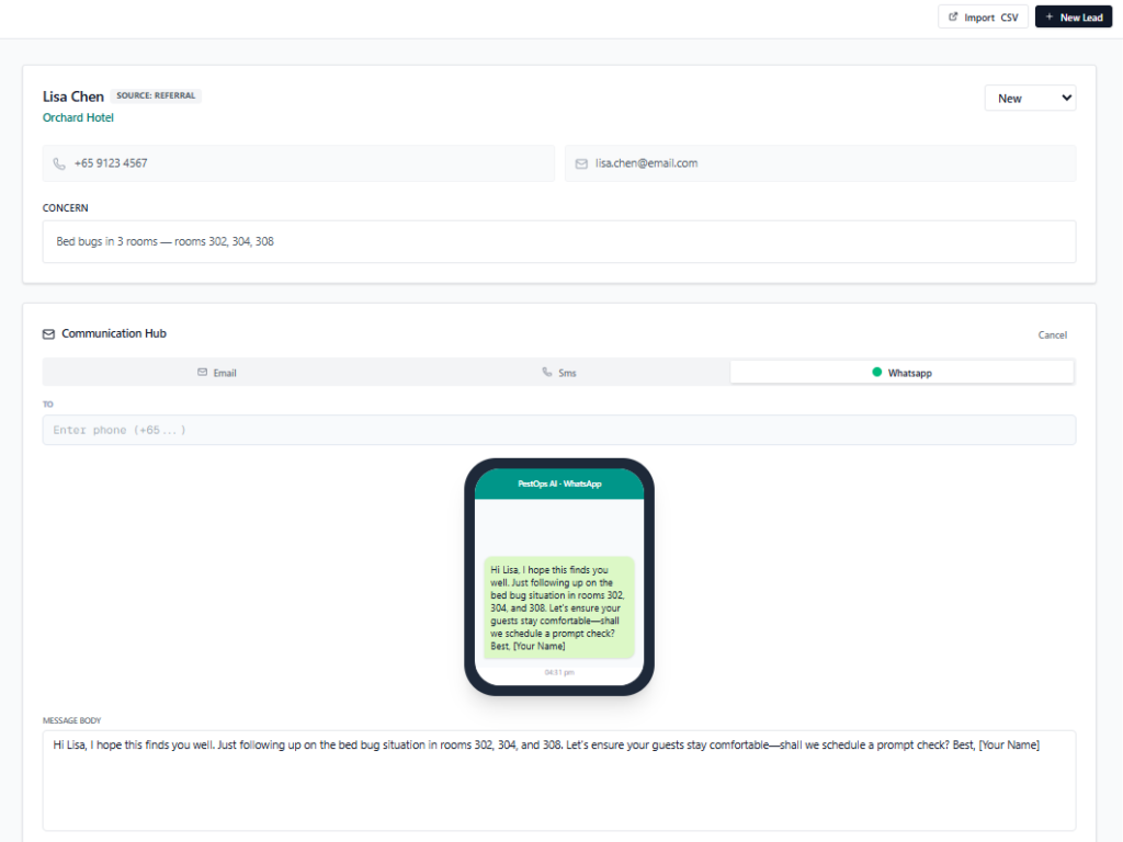 Inbound pest control enquiries arrive across phone, email, and web form — and without a structured qualification layer, high-value commercial leads get buried under residential calls. PestOps AI solves this with an AI-driven Sales CRM that scores and stages every lead the moment it lands. Each entry is tagged New, Contacted, or Qualified, and the AI Qualification engine analyses the concern description to recommend next steps. A built-in Next Action Enforcer blocks pipeline movement until a follow-up task is scheduled, ensuring no lead stalls without an owner. The Communication Hub centralizes all outreach history against the lead record, giving managers full visibility without chasing the team.