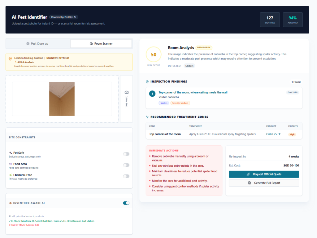 Every pest control technician knows the challenge: arrive on site, photograph evidence, and spend hours cross-referencing species guides before a treatment recommendation can be made. PestOps AI eliminates that delay with a dual-mode Pest Identifier — a close-up mode for single-specimen identification and a room scanner that analyses an entire space in one shot. Upload any photo and the platform returns a risk score, pest species, inspection findings with confidence ratings, and a prioritised treatment zone table — all in under ten seconds. Site constraints such as pet-safe or food-area restrictions are applied automatically, filtering product recommendations before they reach the technician.