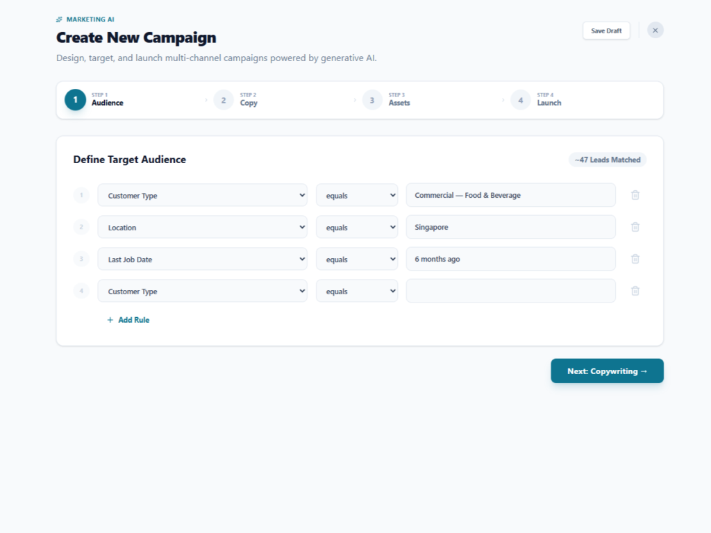 Most pest control operators send the same generic newsletter to every contact list. PestOps AI replaces that with a four-step guided campaign builder powered by generative AI. Teams define an audience segment — commercial, residential, or custom — select delivery channels, and choose a copy tone such as Professional and Direct or Friendly and Urgent. The platform generates compliant email and SMS copy in seconds, displays a live preview with character count and estimated delivery time, and fires both channels simultaneously with one click. Campaigns that previously required an agency brief and a week of back-and-forth are ready to send in under five minutes.