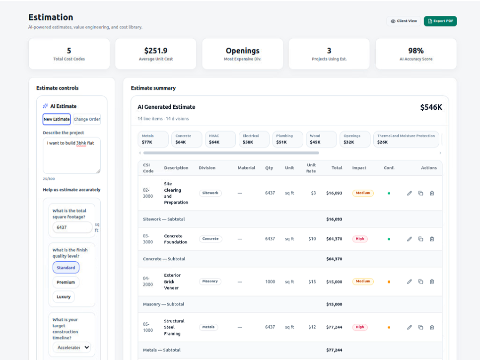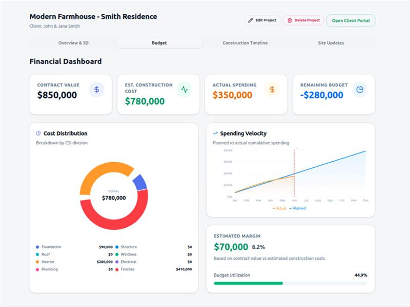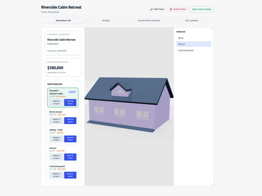 AI is used where it creates practical value: summarizing site updates into polished client recaps, sanity-checking estimates for missing divisions, translating technical construction language into client-friendly change summaries, and generating concept visuals that help homeowners understand selections before work begins. The result is a platform built not just to track a project, but to actively prevent budget surprises, missing scope, and delayed decision