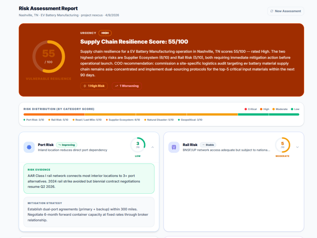 Selecting a site without understanding its supply chain exposure is how projects encounter costly operational surprises after launch. SiteScout’s Supply Chain Risk module runs a six-category assessment — Port Risk, Rail Risk, Road and Last Mile, Supplier Ecosystem, Natural Disaster, and Geopolitical — and returns a composite Resilience Score out of 100 with urgency classification. Each risk category expands to show a scored gauge, risk evidence drawn from live logistics data, and a specific mitigation strategy with actionable timelines. For the EV Battery Manufacturing evaluation shown, the Supplier Ecosystem and Rail Risk categories triggered immediate escalation, with the platform generating a COO-level recommendation to commission a site-specific logistics audit and implement dual-sourcing protocols within 90 days.