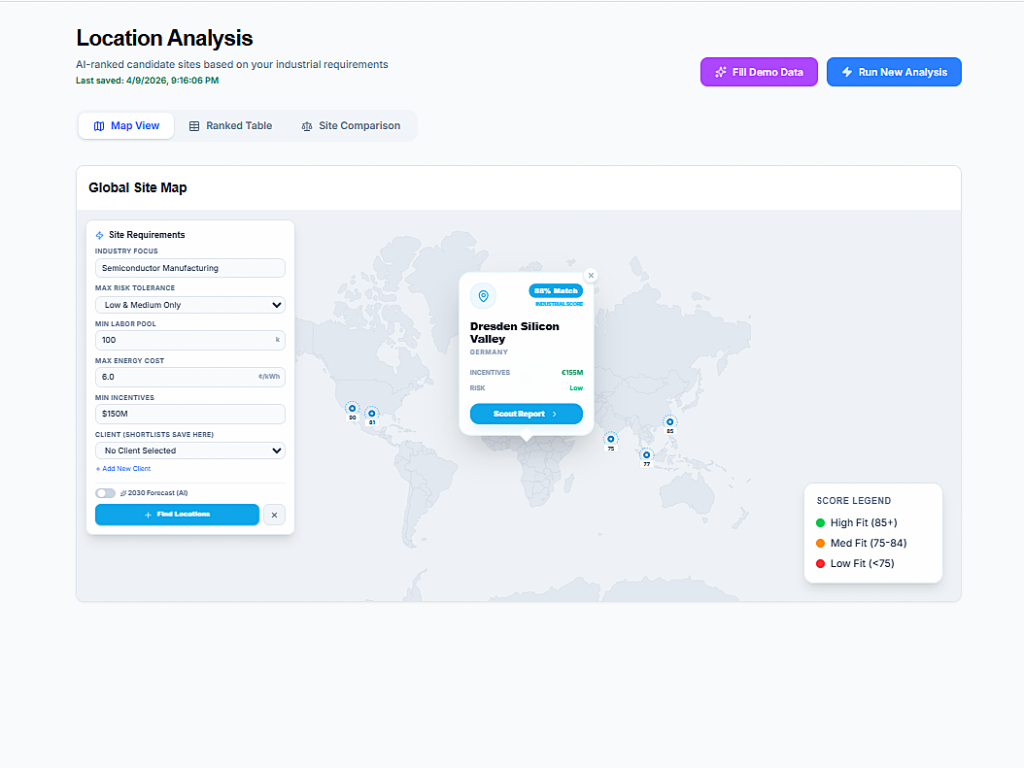 Every economic development team knows the bottleneck: gather requirements, manually review hundreds of candidate locations across different data sources, and spend weeks producing a shortlist before any meaningful comparison can begin. SiteScout AI compresses that process into minutes. Teams enter an industry focus and risk tolerance, and the platform instantly surfaces a ranked global site map — each candidate scored for industrial match, flagged with available incentive packages in dollar terms, and rated for supply chain risk. A Strategic Fit Analysis panel displays the top three recommended sites with match scores and plain-language rationale, so decision-makers arrive at the shortlist stage with structured evidence rather than instinct.